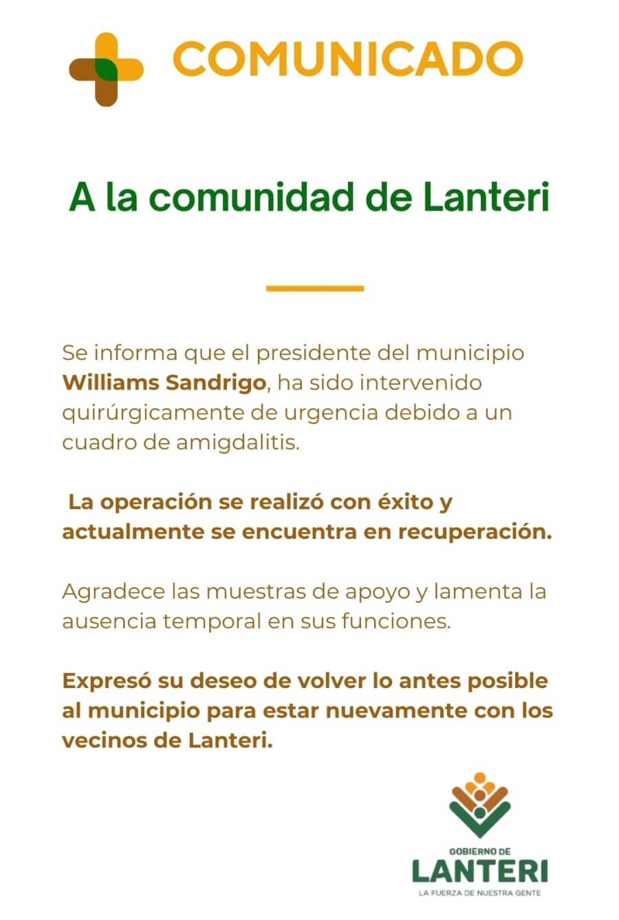 El presidente comunal de Lanteri, Williams Sandrigo, fue intervenido quirúrgicamente de urgencia durante la jornada del miércoles 14 de enero de 2026, a raíz de un cuadro agudo de amigdalitis que requirió atención médica inmediata.