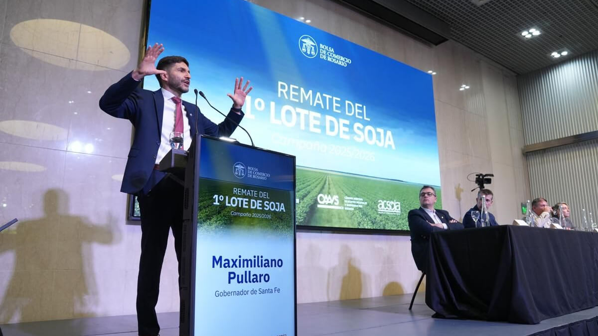El gobernador de Santa Fe, Maximiliano Pullaro, participó este viernes del remate del primer lote de soja correspondiente a la campaña 2025/26, realizado en la Bolsa de Comercio de Rosario.